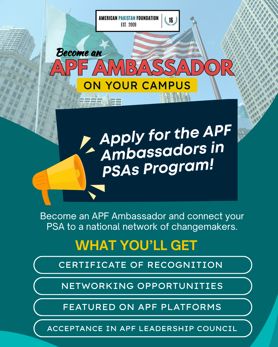 Are you interested in becoming part of a network of Pakistani-Americans, learning vital leadership skills, and attending APF’s events? Join the organization and give back to your Pakistani-American community by becoming an APF PSA Ambassador.